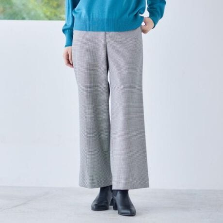 体型カバー効果も期待できる、脚のラインを拾いにくいゆったりとしたワイドシルエットパンツ。