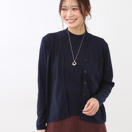 気負わずに羽織れる軽やかさがあり、総針編みのきちんとした表情が魅力の着回しやすいVネックカーディガン。