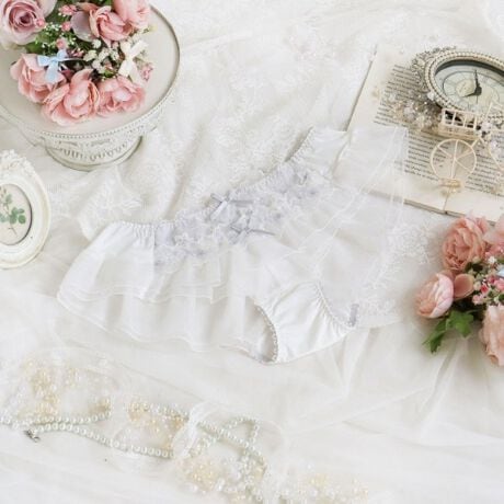 クレマチスの可憐な花々をモチーフに、小花や茎などを繊細なラメ糸で表現したシリーズです。パッカー手法でふっくらと咲かせた大輪のクレマチスは、キラキラとしたラメ糸をあしらい、動くたびにさりげなくきらめく上品なデザインに仕上がりました。フロント部分にあしらわれたギャザーたっぷりのチュールレースは、軽やかでキュートな印象をプラス。毎日を特別な気分にしてくれるような、清楚で可愛らしいコレクションです。