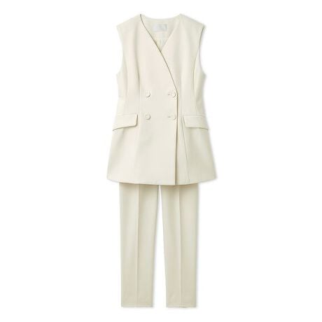 Vネックのダブル仕立ては、1枚でも美しく着られるよう胸元のラインにこだわり、フリルブラウスなどフェミニンなインナーとも好相性。セットのテーパードパンツとの着こなしは、マニッシュさと女性らしさが絶妙に調和した、品格漂うスタイルに。