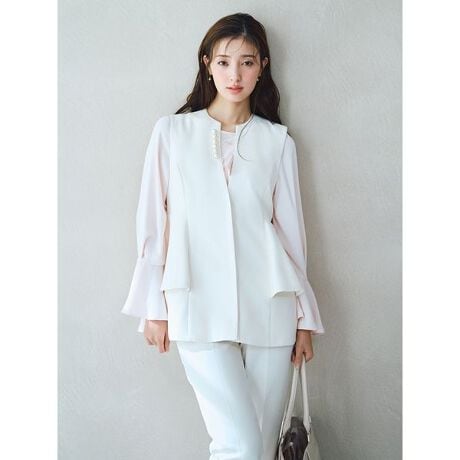 ブラウスを合わせてジレとしてはもちろん、ノースリーブトップスとしても着用できます。フリル下にはポケットもついていて、ご自宅で手洗い可能で実用性にも優れています。