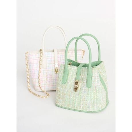 四角いマチが特徴の小ぶりのツイードトートバッグ。