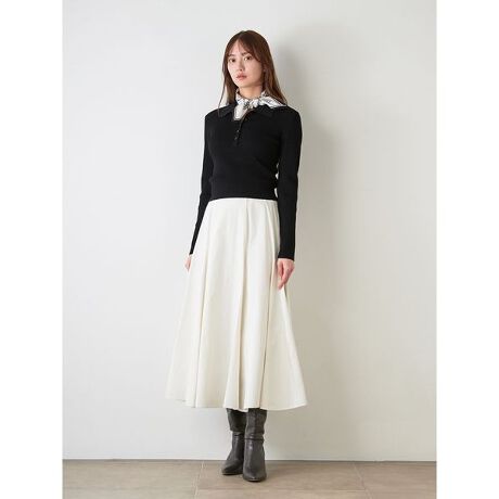 エレガントなSNIDELオリジナルスカーフと、ポロ衿のニットトップス、そしてフレアスカートの3点がセットになった便利なアイテムです。長袖ニットはリブ編みで、やや光沢感のある上品な印象の糸を使用しています。フロントのボタンを2個程開けて抜け感を出して着用し、首元にくるっとスカーフを結ぶのがおすすめコーディネートです。スカートは軽やかな薄手のタフタ生地を使用し、高めの位置からマチを入れてたっぷりのフレアシルエットでお作りしました。美脚効果も抜群です。後ろウエスト位置にはゴムを入れてフィット感をプラス。ファスナーで着脱が可能です。スカートは裏地付きなので安心です。それぞれのニットの色に合わせてスカーフもオリジナルで色をセレクトしました。それぞれ単品使いにも便利なセットアイテムです。