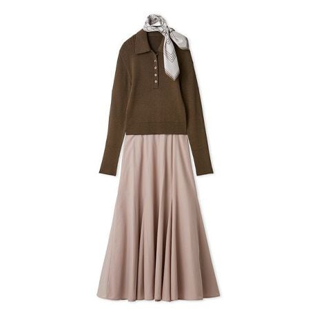 エレガントなSNIDELオリジナルスカーフと、ポロ衿のニットトップス、そしてフレアスカートの3点がセットになった便利なアイテムです。長袖ニットはリブ編みで、やや光沢感のある上品な印象の糸を使用しています。フロントのボタンを2個程開けて抜け感を出して着用し、首元にくるっとスカーフを結ぶのがおすすめコーディネートです。スカートは軽やかな薄手のタフタ生地を使用し、高めの位置からマチを入れてたっぷりのフレアシルエットでお作りしました。美脚効果も抜群です。後ろウエスト位置にはゴムを入れてフィット感をプラス。ファスナーで着脱が可能です。スカートは裏地付きなので安心です。それぞれのニットの色に合わせてスカーフもオリジナルで色をセレクトしました。それぞれ単品使いにも便利なセットアイテムです。