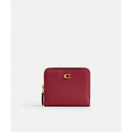 ポリッシュド ペブル レザーの二つ折りミニ財布。シグネチャー ハードウェアが目を引きます。3辺に大きく開く小銭ポケットは、レシートやイヤフォンの収納にも便利な仕切り付き。スナップを外すと、8層のカードポケットと札入れが広がります。