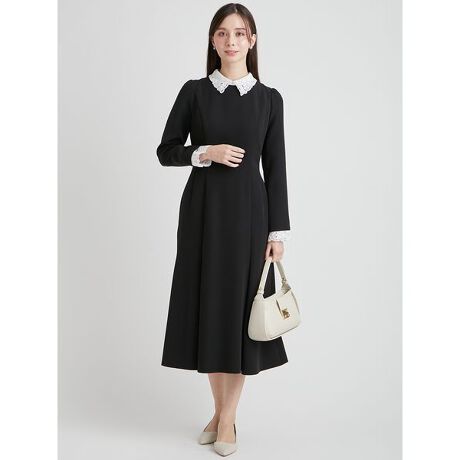 動くたびに美しく揺れる裾が、優雅で女性らしい印象を際立たせます。衿とカフスには繊細なレース刺繍をあしらい、フラットな素材とのコントラストが上品なクラシックムードを演出。