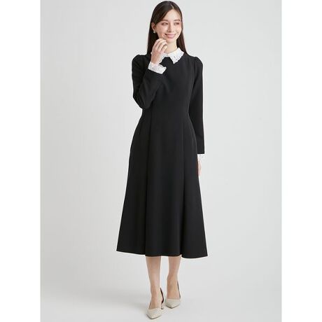 動くたびに美しく揺れる裾が、優雅で女性らしい印象を際立たせます。衿とカフスには繊細なレース刺繍をあしらい、フラットな素材とのコントラストが上品なクラシックムードを演出。