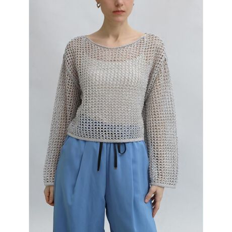 繊細に煌めくラメ糸がコーデを一気に華やかにするニットトップス。粗めに編まれたニットから覗かせるインナーとのコントラストが女性らしいい逸品。短すぎず長すぎない丈間がアウトスタイルでも重たくならずスタイル良く着こなせる一品。ドライタッチな質感からレイヤードスタイルの活用でロングシーズン活躍するアイテムです。