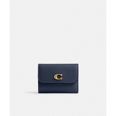コンパクトなデザインながら整理整頓しやすい、カードホルダー付き三つ折り財布。リファインド レザーにコーチの“C”のハードウェアが目を引きます。