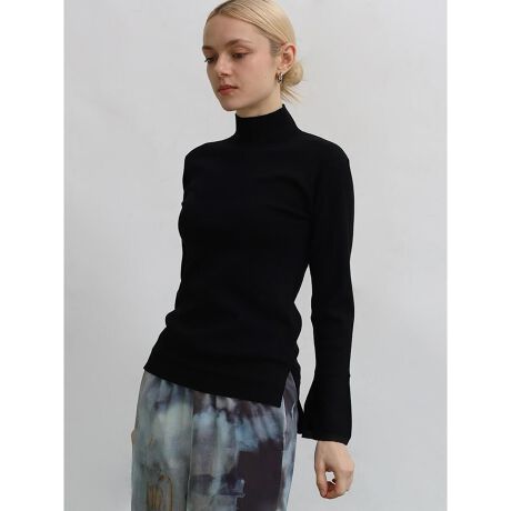 シアー素材とドッキングしたラッパ袖がさりげなくアクセントになったニットトップス。身体に寄り添うフィット感が上半身をスタイル良く魅せてくれる一枚。インアウトのしやすいバランスの取れた丈間がボトムスを選ばず幅広いスタイルに活躍します。