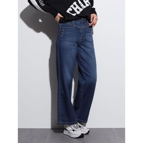 スタイルを選ばないストレートシルエットで仕上げた、ポケットのボタンがさりげないアクセントになるデニムパンツ。