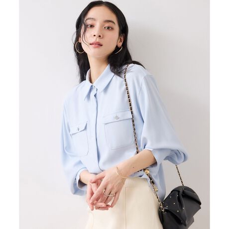シルバーの紋章入りメタル釦がポイント。ベーシックなシャツ型ブラウスですが袖にボリュームを持たせており女性らしい印象に。
