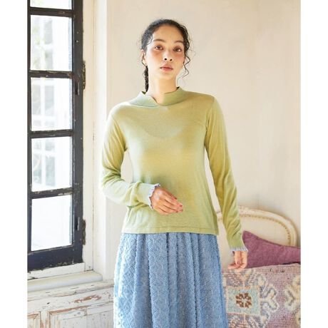 滑らかで肌触りの良いニットプルオーバー。スッキリとしたシルエットで、カーディガンやアウターとの相性もばっちりです。襟はほどよいスタンドネックデザインで露出が少なめなのも嬉しいポイント。袖口の配色フリルがポイントになり、インナー使いとしても重宝します。襟元の小さなV字のスリットにも注目。