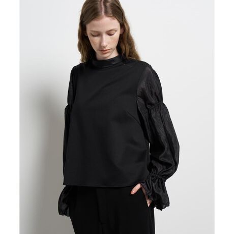 ギャザーをふんだんにあしらった袖が存在感のある異素材使いのトップス。