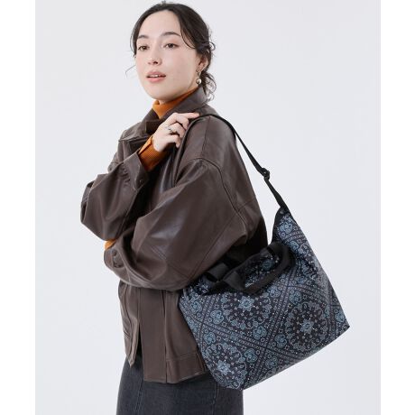 トレンドのウエスタンテイストを取り入れたバンダナ柄プリント。ダークグレーの背景に繊細なティールグリーンとホワイトのペイズリー柄をあしらい、ブラックのトリムで全体を引き締めたシックな印象です。