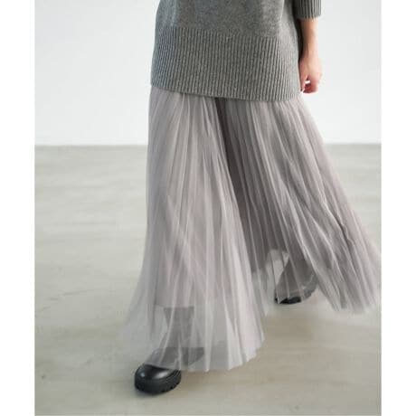 表情豊かなランダムプリーツと繊細なチュールが重なり合う、2枚仕立てのマキシ丈スカートです。