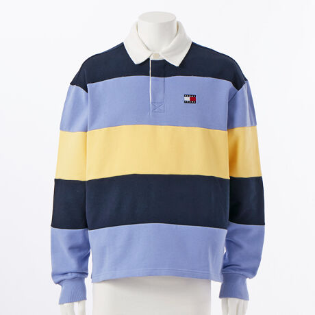 ラグビーカラーでスポーティに決めたトレーナー。メリハリの利いた3トーンボーダーがしっかりと存在感を主張します。シルエットはリラックスフィットを採用し、左胸にはブランドアイコンのバッジロゴをセット。柔らかな裏起毛仕立てで、着用した瞬間もヒヤッとせず、暖かな着心地が持続します。裏地:裏起毛