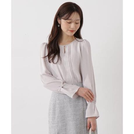 フロントタックと襟元の金属ホックがポイントのキレイめブラウス。詰まりすぎないネックラインが程よい女性らしさを演出してくれます。袖口にかけてほんのりボリュームを出したシルエットもポイント。裏地つきなので透け感を気にしないで着用いただけます。