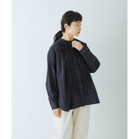 前身頃にテープ状の共布でフリルをあしらったワイドシャツ。どこか上品で甘さは控えめ、大人も手に取りやすいデザインです。ノーカラーなのでかしこまりすぎず程よくラフな印象で着用いただけます。いつものボトムを合わせるだけで新鮮な装いに。上からジャケットを羽織るスタイリングもおすすめ。オケージョンシーンにも活躍しそうです。