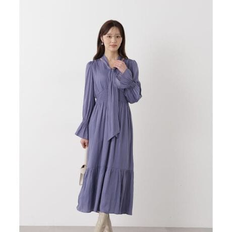程よい光沢感がある割線生地を使用したギャザーワンピース。ウエストゴム仕様でラクな着心地ながらも、割線生地特有の微光沢が上品な印象を叶えてくれます。手首をきゅっと締めたキャンディースリーブがアクセント。付属のロングタイは、首元で巻くと大人の女性らしさを引き立てます。