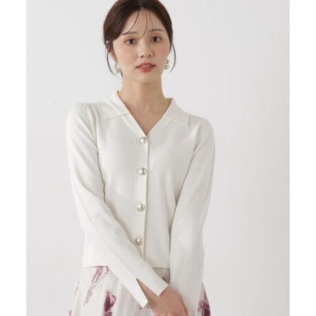大きめの襟が女性らしいデザインの総針ニット。肩のギャザーや程よく開けたネックラインもフェミニンな印象に見せてくれます。フロントに付けた飾りボタンが目を引くポイント。パンツでもスカートでも着回せます。