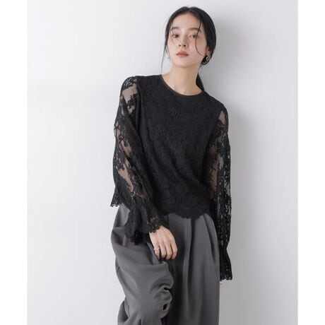 繊細なコードラッセルレースを贅沢に使用した総レースブラウス。裾と袖口はレースのスカラップを生かした断ち切り仕様で、華やかさの中に抜け感をプラスしたディテールも素敵です。