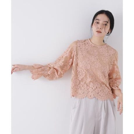 繊細なコードラッセルレースを贅沢に使用した総レースブラウス。裾と袖口はレースのスカラップを生かした断ち切り仕様で、華やかさの中に抜け感をプラスしたディテールも素敵です。
