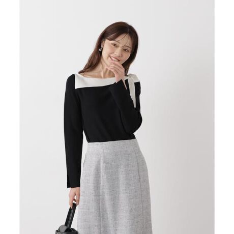 ネックラインをキレイに見せてくれる総針ニット。襟ぐりのアシンメトリーなラインとリボンが目を引くデザインです。首元が広めに開いていますが、下着のラインを気にしないで着用いただけます。色によって配色を効かせたリボンがアクセント。キレイめデイリースタイルに活躍してくれます。