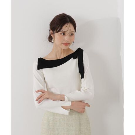 ネックラインをキレイに見せてくれる総針ニット。襟ぐりのアシンメトリーなラインとリボンが目を引くデザインです。首元が広めに開いていますが、下着のラインを気にしないで着用いただけます。色によって配色を効かせたリボンがアクセント。キレイめデイリースタイルに活躍してくれます。