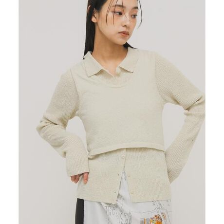 表面感のあるブークレ素材を使用したニット。シャリ感はありつつ肌触りの良い糸を使用しており、レイヤードデザインは1枚で主役級のスタイリングが簡単に叶います。セット使いはもちろん、別々でも使用いただけるので着回し力の幅も広がるアイテムです。ボリュームのあるボトムから、すっきりとしたスカートまで合わせられます。