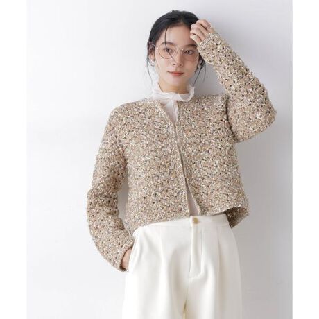 一枚一枚、かぎ針で丁寧に編み上げたハンドクロシェのカーディガン。手編みならではの柔らかな凹凸感と、奥行きのあるカラーリングが特徴。ハンドメイドの温もりとモダンなシルエットを兼ね備えた、大人の女性にふさわしい一着です。