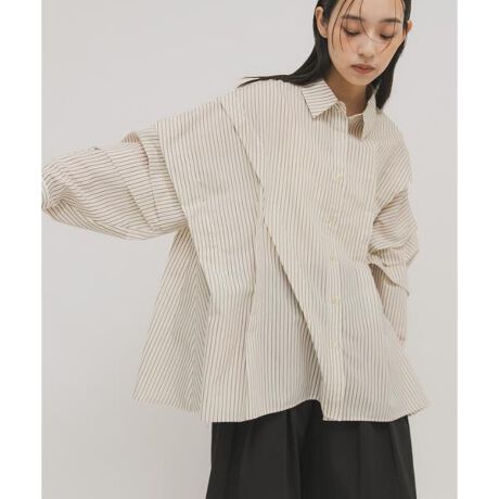 アシンメトリーに施したタックが様々な動きを見せてくれるストライプ柄シャツ。裾に向かってフレアになったシルエットもポイントです。ゆったりとした身幅ながらも、ウエストがシェイプしたように見えます。カジュアルなデニムから女性らしいアイテムまで合わせていただけます。