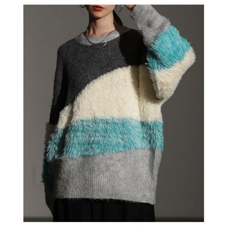 まるで波のような配色が印象的なシャギーニットトップスです。メリハリ配色が主役級の存在感を放ちます。ふわふわ肌触りの良いシャギーニットで着心地も抜群です。