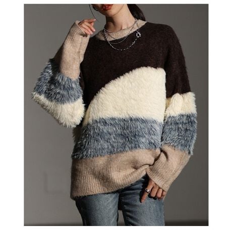 まるで波のような配色が印象的なシャギーニットトップスです。メリハリ配色が主役級の存在感を放ちます。ふわふわ肌触りの良いシャギーニットで着心地も抜群です。