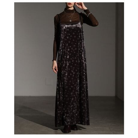 ベロア生地に散りばめられた小花模様が大人可愛いキャミワンピースです。光沢感のあるベロア生地が甘さを程よく抑えてくれます。敢えて長めに残された肩紐がスタイリングに動きをプラス!ジャンパースカート風に着こなしたり、カーディガンを上から羽織ったりと着こなしが広がります。