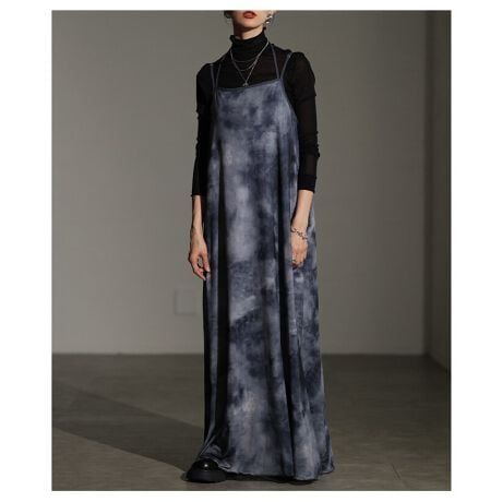 【ワンピース】 マーブル チュール キャミソール ロング マキシ 重ね着 グレー ブラウン ブルー