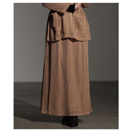 有りそうでなかったメッシュ素材のストレートスカートです。ウエストはゴム仕様、デザインのポイントにもなるドローコード入りで調整可能です。同じ生地で作られた「almam-1715」とのセットアップ可能アイテムです。