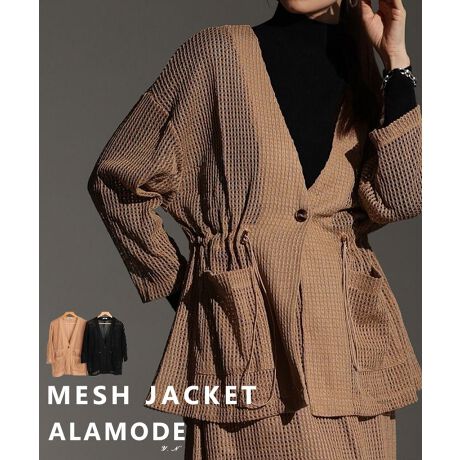 ロングシーズン活躍するメッシュ素材のジャケットです。ウエストにはデザインのポイントにもなるドローコード入りでペプラム風のシルエットにもなる優れもの。同じ生地で作られた「almam-1716」とのセットアップ可能アイテムです。