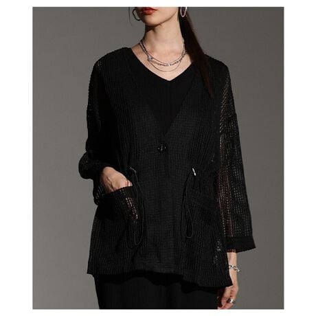 ロングシーズン活躍するメッシュ素材のジャケットです。ウエストにはデザインのポイントにもなるドローコード入りでペプラム風のシルエットにもなる優れもの。同じ生地で作られた「almam-1716」とのセットアップ可能アイテムです。