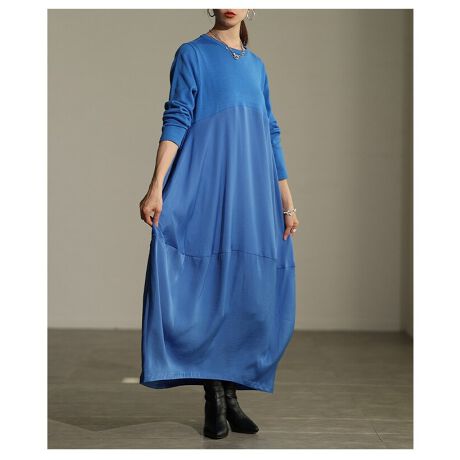 【ワンピース】 レディース ロング ニット 長袖 布帛 シンプル カジュアル 体型カバー 春 秋 冬