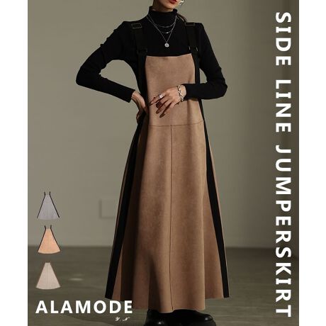 身頃のスエード調の生地とサイドが異素材切替になったモードなデザインのジャンパースカートです。中に合わせるトップス次第で何通りもコーデが楽しめますよ☆