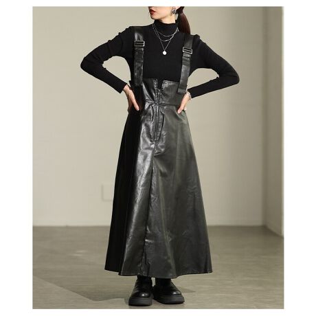 フェイクレザー素材のサロペットスカートです。クールな印象を与えるフェイクレザーに女性らしいフレアシルエットが相まって大人の甘辛コーデに。合わせるトップス次第で様々な着こなしをお楽しみいただけます。