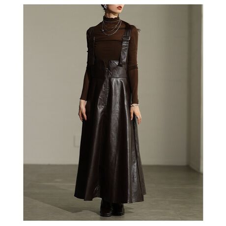 フェイクレザー素材のサロペットスカートです。クールな印象を与えるフェイクレザーに女性らしいフレアシルエットが相まって大人の甘辛コーデに。合わせるトップス次第で様々な着こなしをお楽しみいただけます。