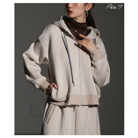 【パーカー】 トップス 羽織り チャコール ベージュ サックス 長袖 ロゴ ジップアップ フード 冬