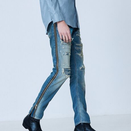 定番5ポケットのスキニーパンツをベースに、存在感あるメタルジッパーを両サイドに走らせた唯一無二のデザイン。フロントにクラッシュ加工などハードなカスタムを施しました。