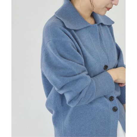 カシミヤ混の、もっちりとした柔らかい手触りの素材。1枚着でも、ジャケットやアウターのインでも使いやすい肉感です。羽織りとしても、釦を閉めて一枚着風にも着こなせるカーディガン型。スキッパープルオーバー風に着こなすのも素敵です。