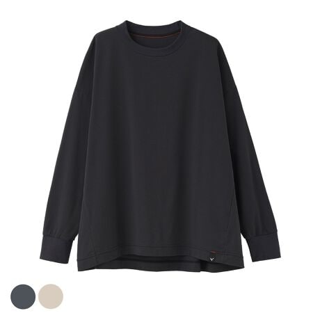 前後差をつけた女性らしいAラインシルエットのロングスリーブTシャツは、ネックと袖口にフライスリブを付けメリハリあるデザインに。また、脇ハギを前方に寄せ、縫目の肌当たりを軽減するリカバリー仕様にしました。
