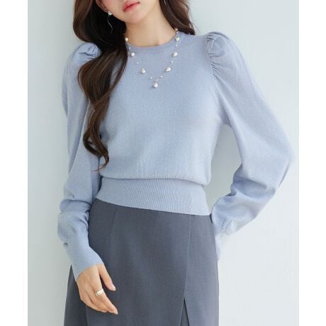 ニット レディース トップス クルーネックニット プルオーバー ギャザースリーブ パフスリーブ ボリューム袖 裾リブ 袖リブ ブラウジング裾 通勤 きれいめ フェミニン 可愛い シンプル 女の子 SAISON DE PAPILLON【ギャザースリーブがフェミニンなクルーネックニット】ハイゲージ オケージョン オフィス 普段使い きちんと感 セゾンド パピヨン