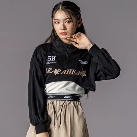 ドロップショルダーのハーフジップトップスと、ロゴゴム裾の半袖Tのセットアップ。