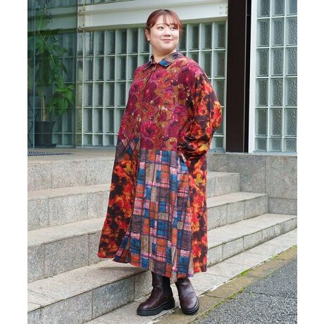 大きな花柄と、ふわっとしたぼかし柄の中にチェックを効かせた、存在感たっぷりのAラインワンピース。